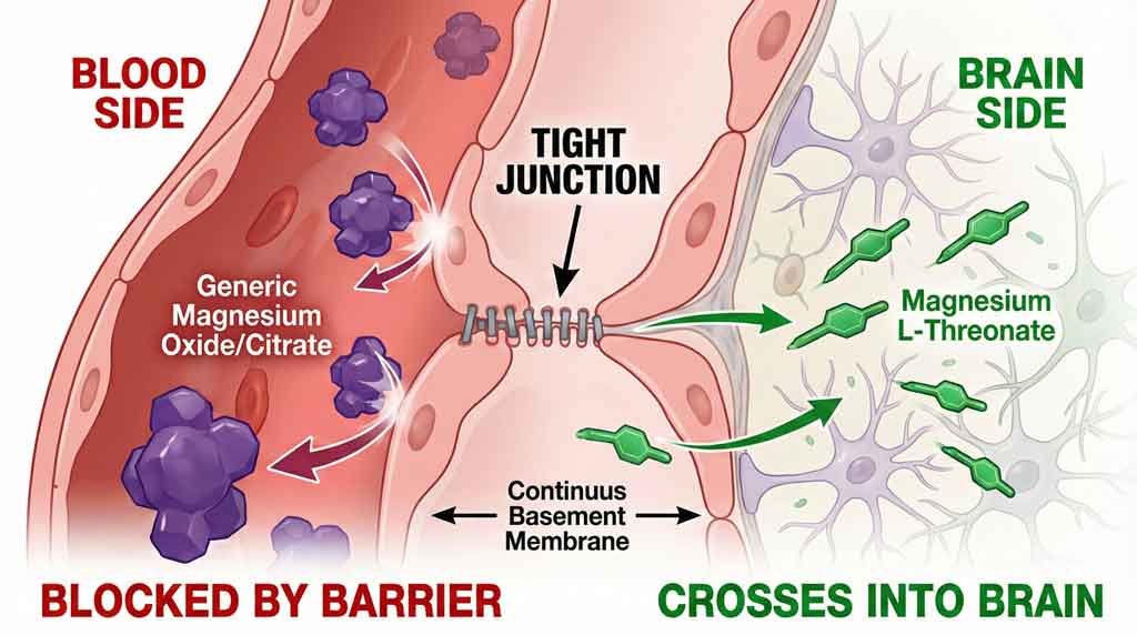 Most magnesium supplements (like Magnesium Oxide or Citrate) act primarily as laxatives. They sit in your gut, they might help you go to the bathroom, but they are too large to cross the Blood-Brain Barrier.